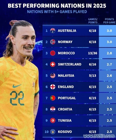 10月9日讯 德转统计2025年至今参加5场以上赛事 的各国国家队战绩,