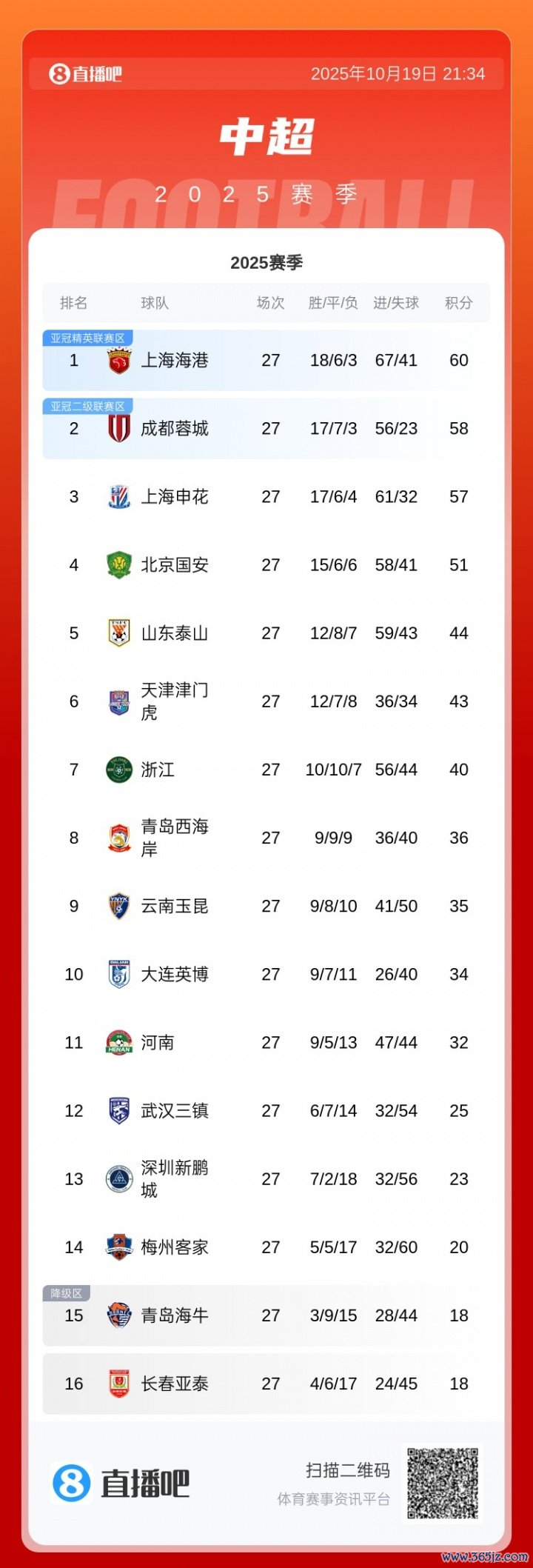 10月19日讯 中超第27轮结束,青岛海牛3-4不敌上海海港,梅州客家1-3成都蓉城,德甲深圳新鹏城2-1北京国安,