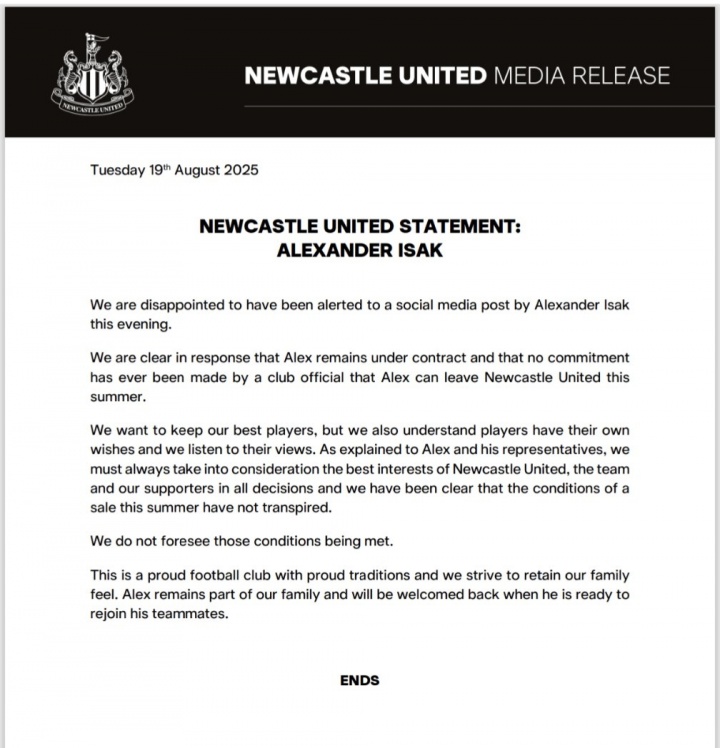 纽卡在声明中表示:今夏转会条件尚未达成,球队也不认为这些条件会得到满足。因此伊萨克大概率走不了,但喜鹊随后在文末示好:亚历山大仍是我们大家庭的一员,当他准备好重返球队时,我们将剧烈 欢迎他回归。