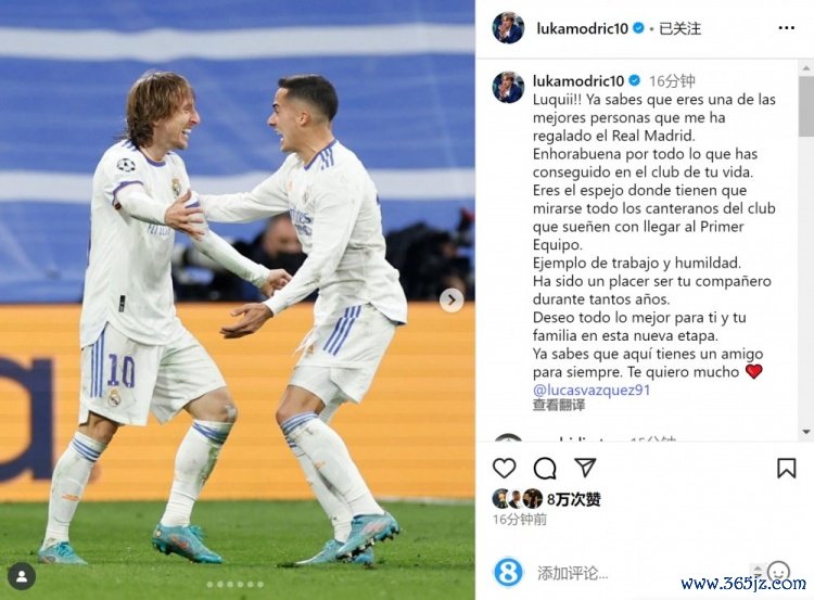 7月18日讯 巴斯克斯自由身离开皇马,莫德里奇社媒发文致敬。