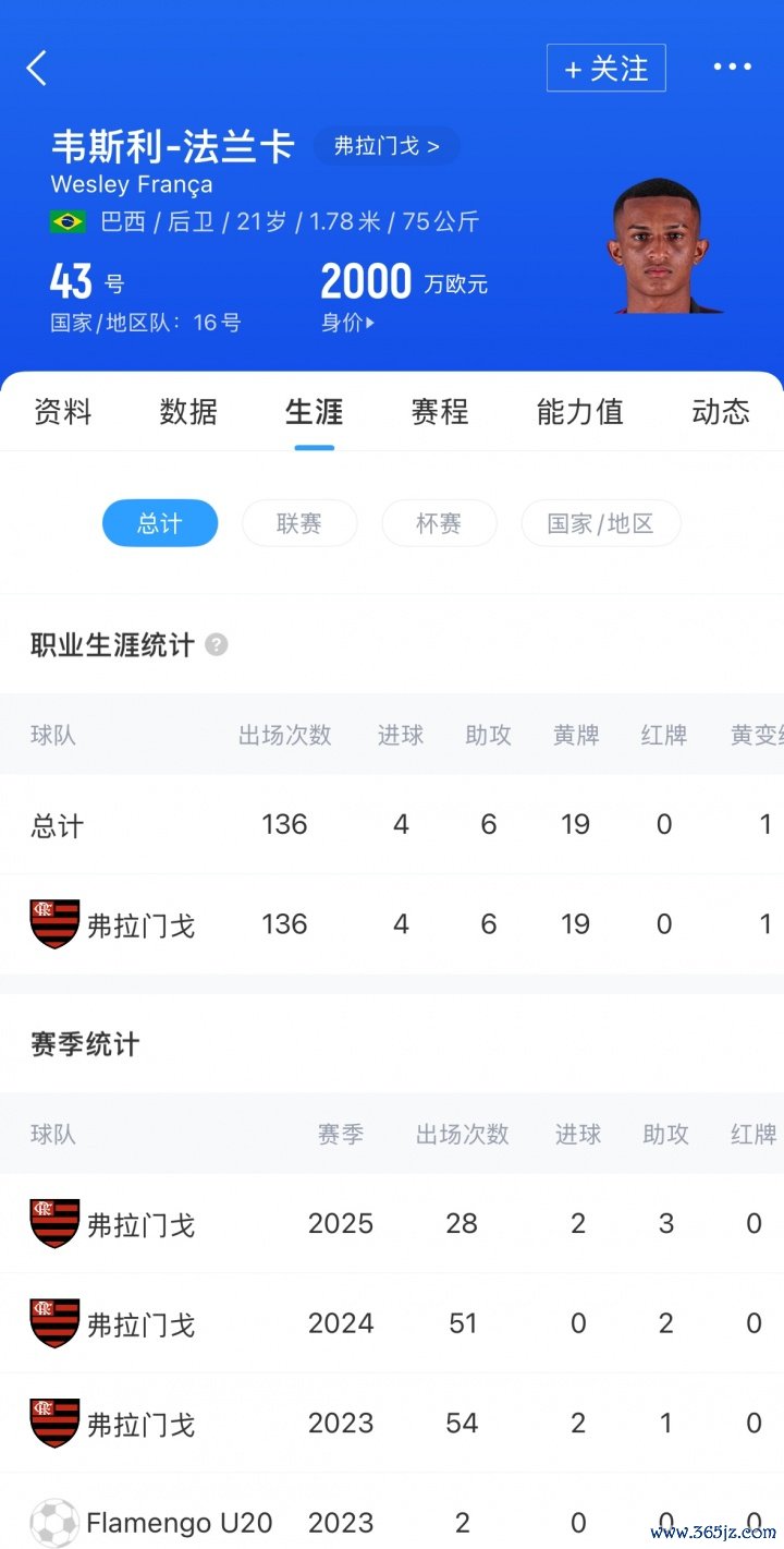 21岁的韦斯利司职右后场球员,本赛季为弗拉门戈28场贡献2球3助功 ,德回转 价2000万欧元。