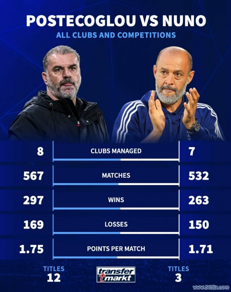 9月10日讯 前热刺主帅波斯特科格鲁接替努诺成为诺丁汉森林新帅,德转也对比了两位主帅在执教俱乐部生涯各项赛事战绩, 乒乓球资讯足球直播吧具体如下: