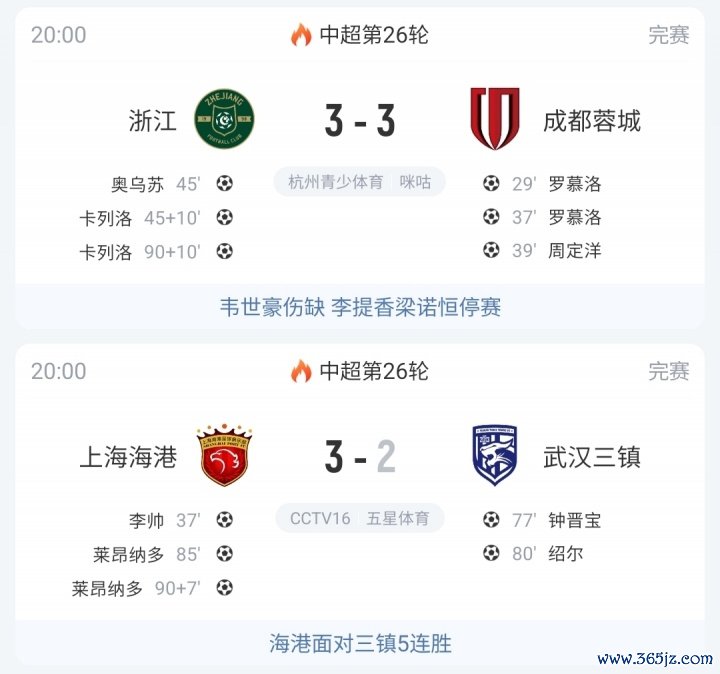 09月26日讯 中超第26轮,蓉城3-3遭浙江绝平,海港3-2致胜球 三镇,海港2分领跑积分榜。
