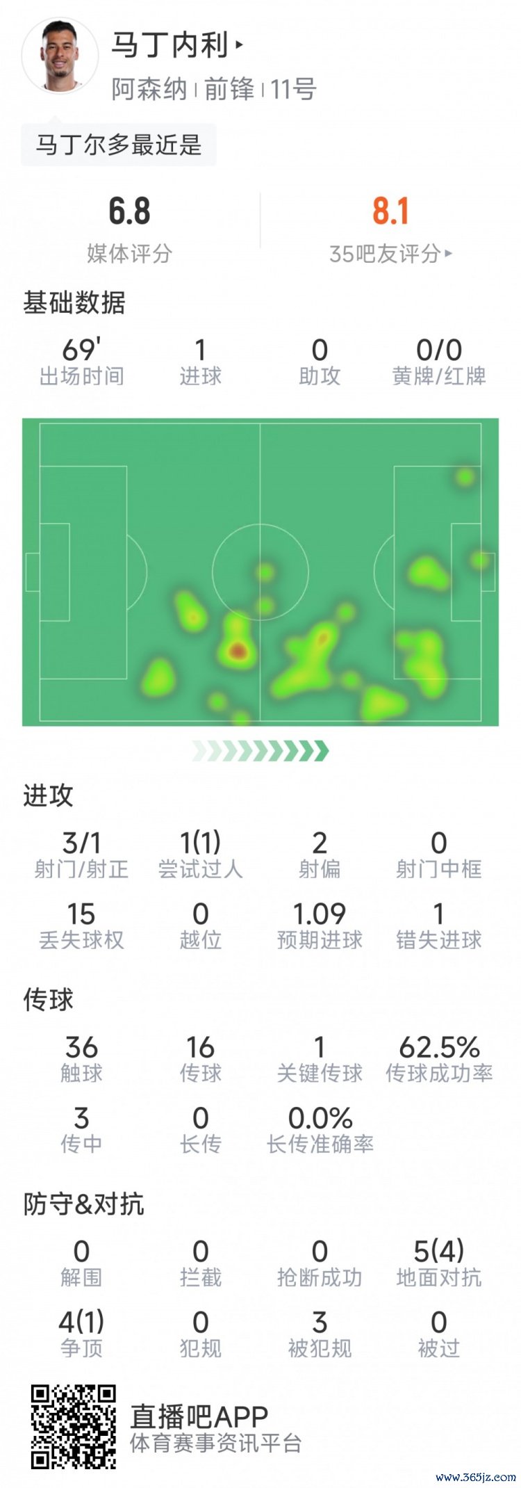 10月2日讯 在本轮欧冠阿森纳对阵奥林匹亚科斯的赛事 中,马丁内利得分 ,德甲英超直播以下为他在本场数据: