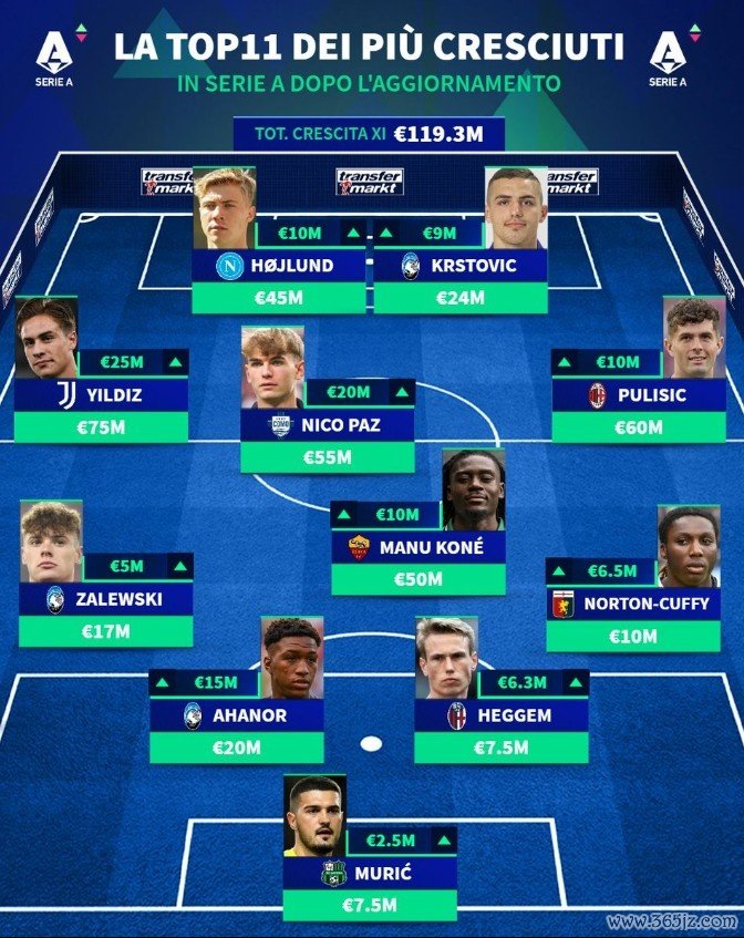 意甲球员身价涨幅阵:霍伊伦、普利西奇、伊尔迪兹、帕斯在列